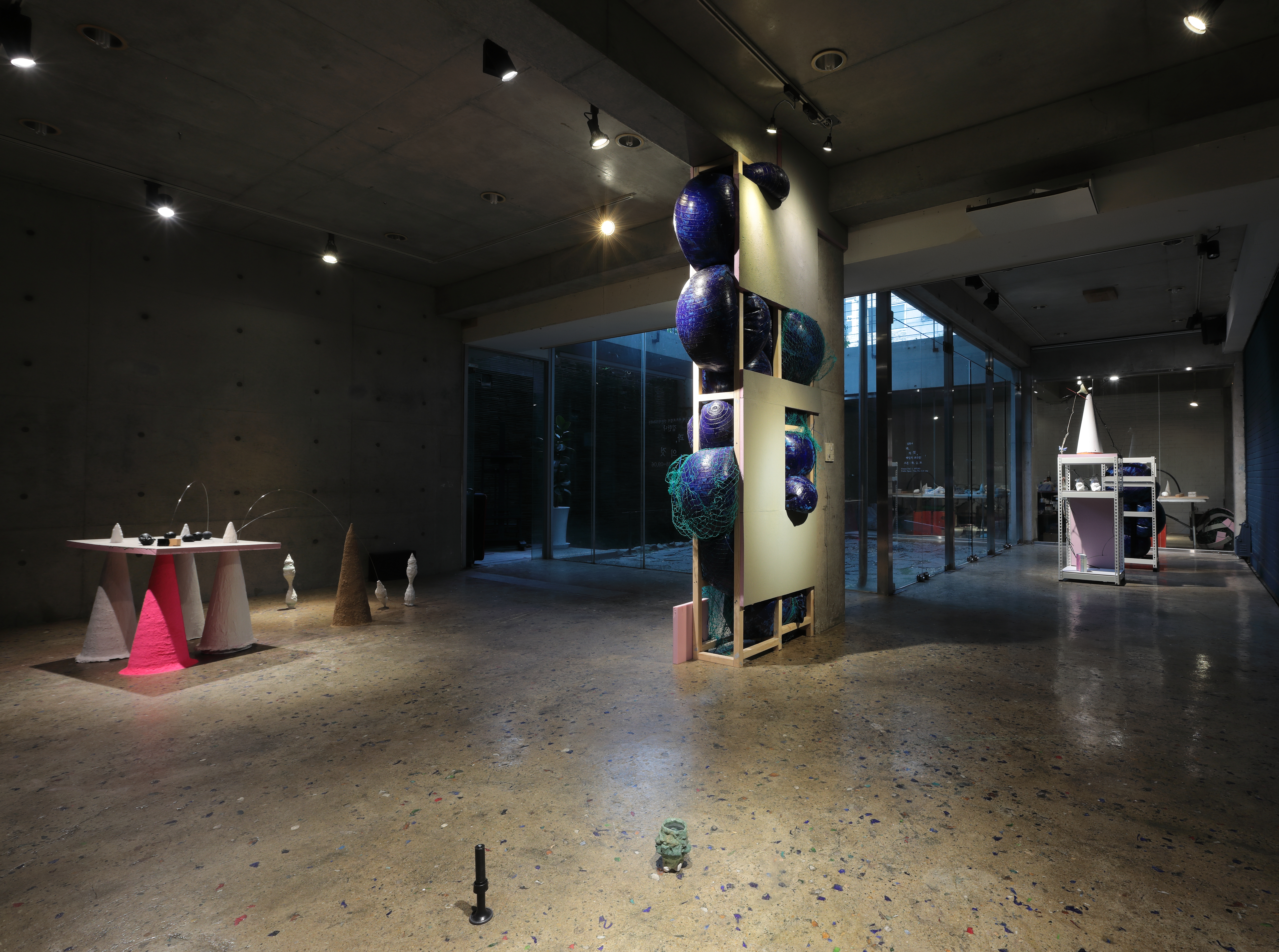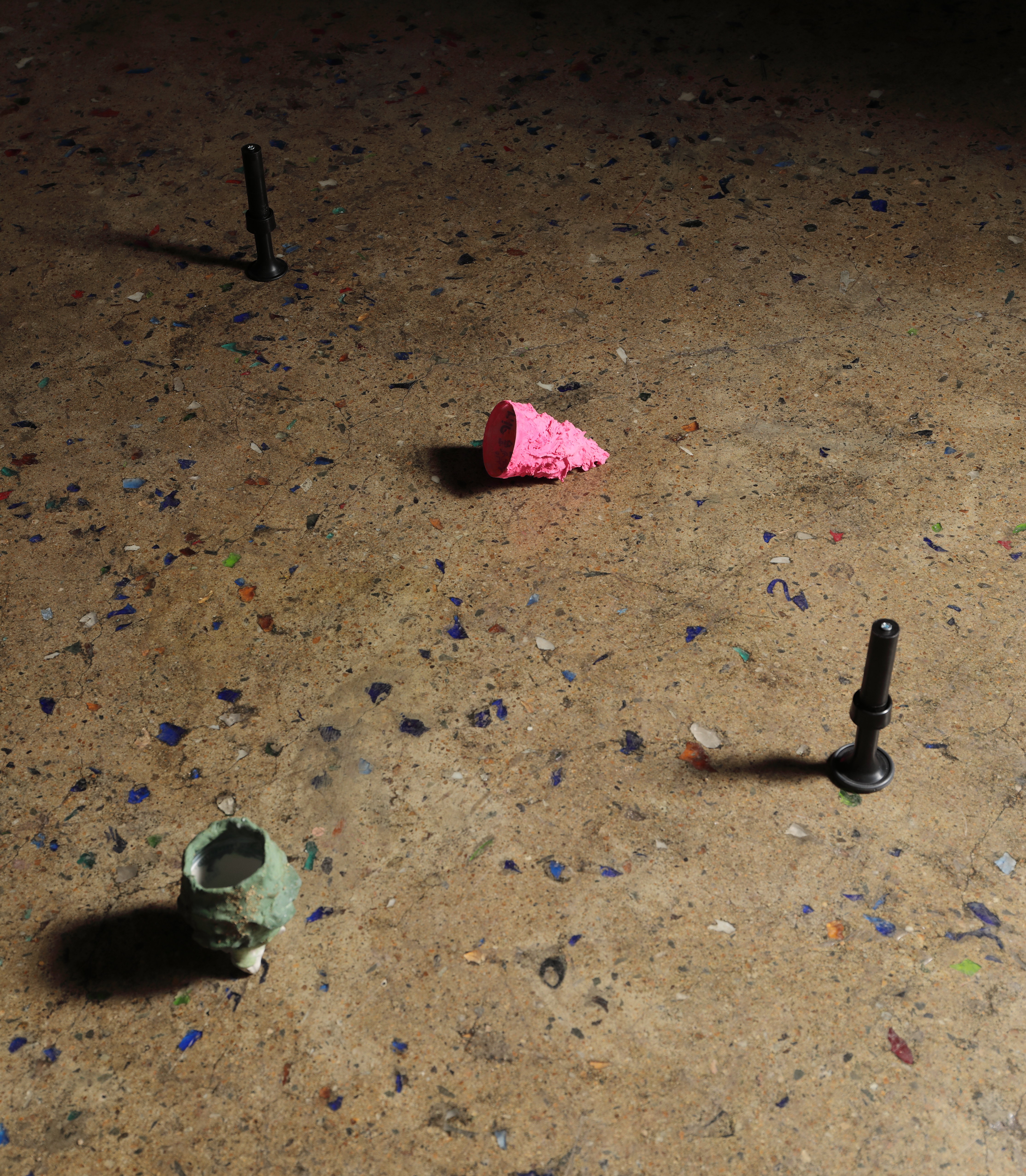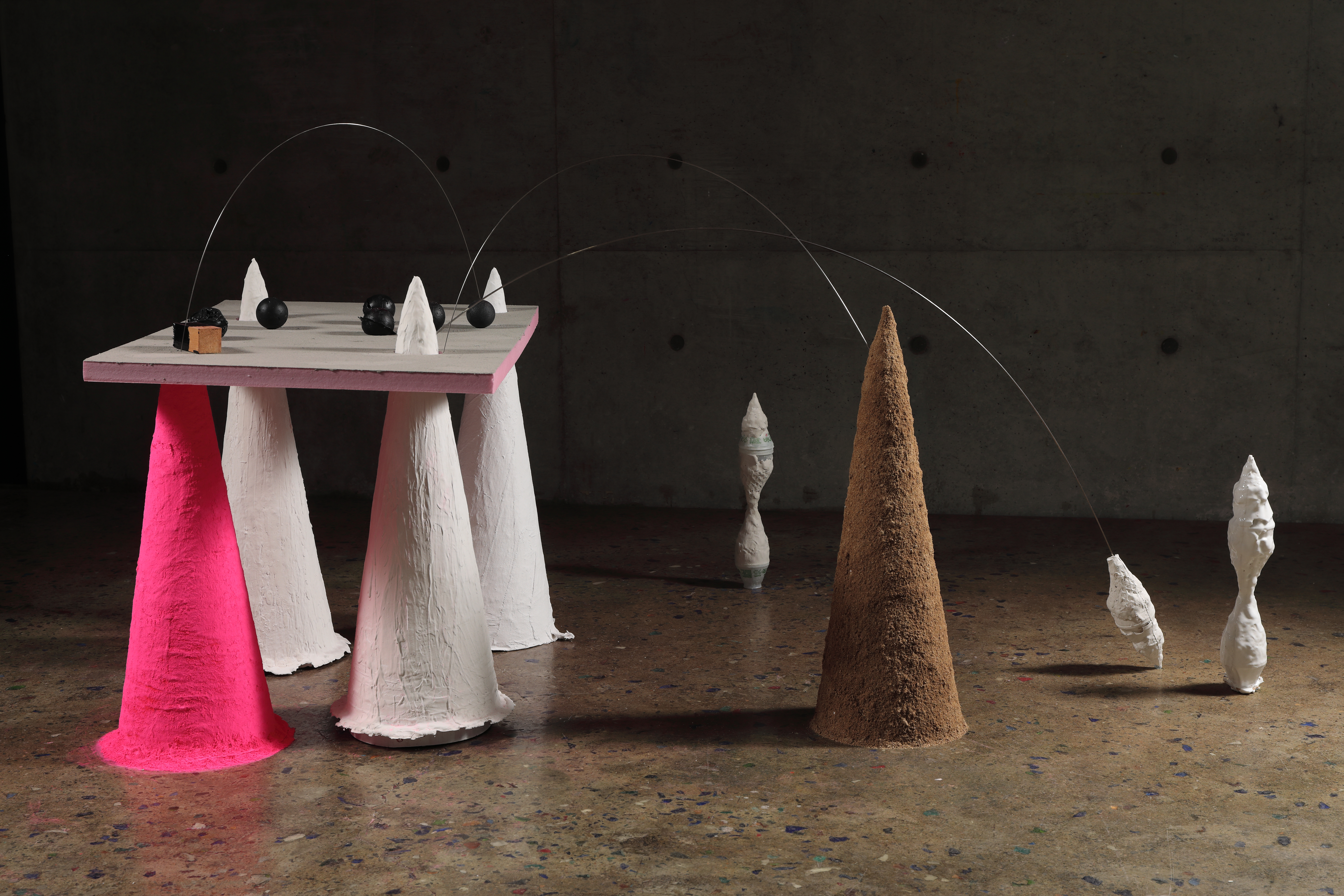 Pink Pigment, Sand, Wire, Cone-Shaped Plaster, EPS, Black Things Dimensions Variable