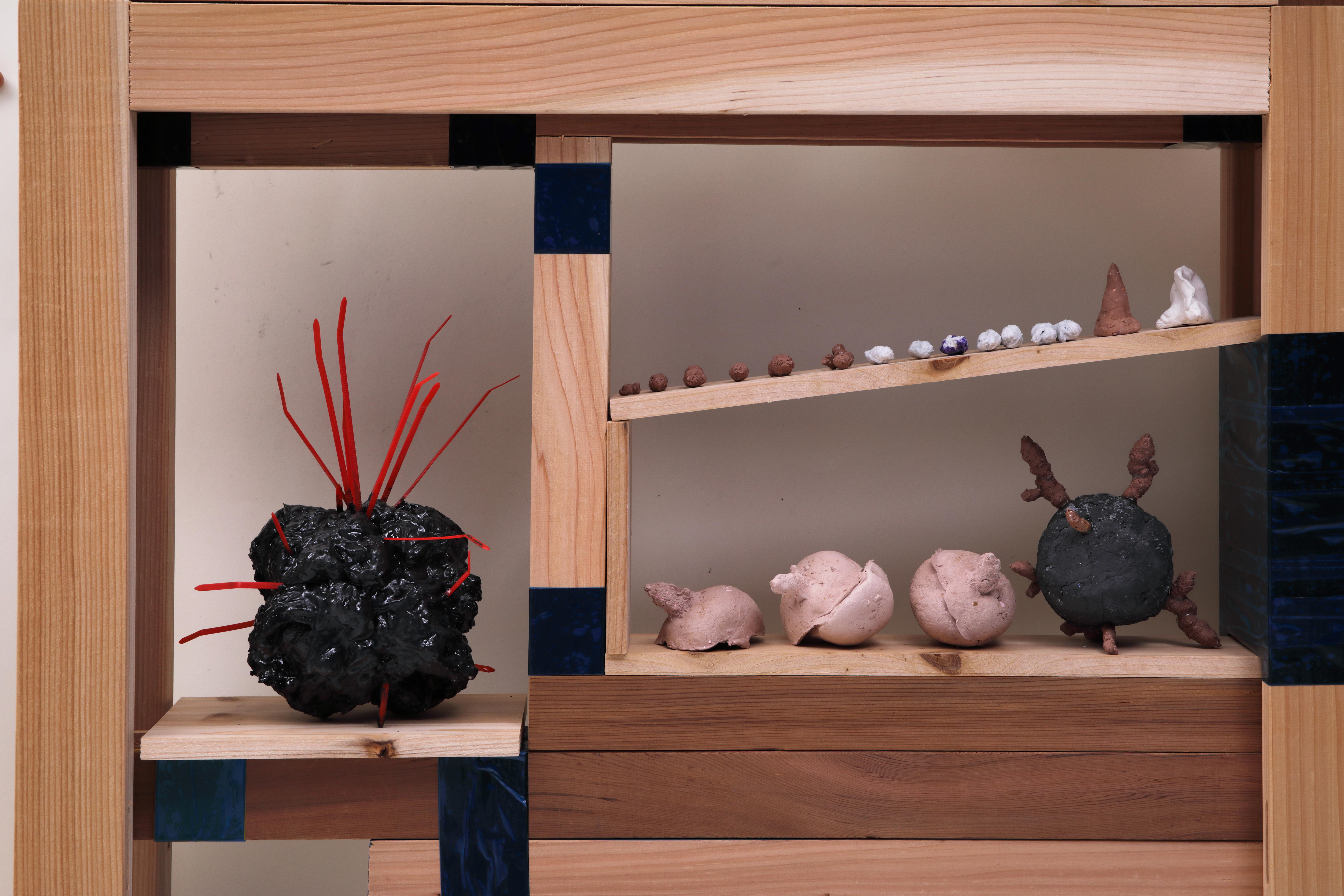 Wood Structure, Cast Black Silicon Things, Wire, Paint 155 x 156 x 11 cm